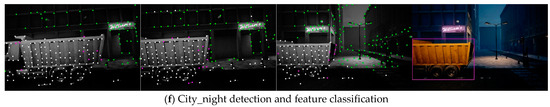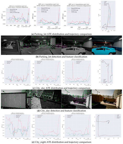 Furthermore, D-VINS showed great performance in feature classification and trajectory accuracy in rural and city sequences, as shown in Figure 12. For our real dataset, DynaVINS faced challenges in accomplishing the localization task. Higher reprojection errors could arise from both the camera movement and dynamic features, making it difficult to accurately indicate the feature’s motion state using weights. In sequences with large spaces and without loop closures, VINS-Fusion performed worse compared to D-VINS. However, the segmentation accuracy depends on the bounding boxes obtained from YOLOV5, making it unable to achieve pixel-level precise segmentation. Factors such as the complexity of moving objects and blurry images can influence the results of object detection and geometric calculations. These influences can degrade the segmentation accuracy and, ultimately, impact the camera localization precision.