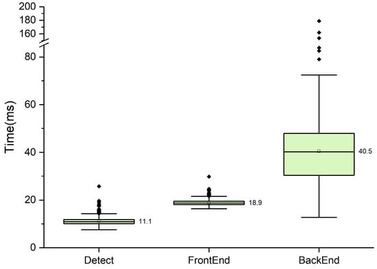 The box plot of the running time in each part of D-VINS. The average time to process one frame is about 70.5 ms (14 Hz).