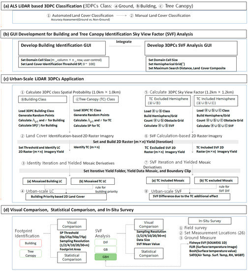 Study workflow. Airborne laser survey (ALS) LiDAR-based 3DPC classification was performed; subsequently, graphical user interface (GUI) development for building/tree canopy (TC) identification and sky view factor (SVF) analysis was performed. LiDAR-based Urban scale maps were generated, and visual/statistical comparisons were made, followed by an in situ survey.