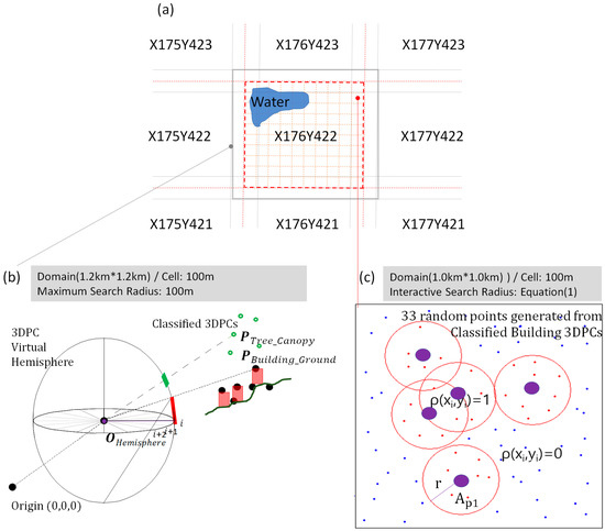 where is the total area of the sustaining disk and is the projected area of each hemispherical grid cell. The sustaining disk had three layers to separately calculate the three classified 3DPCs (ground, building, and TC). When three classified 3DPCs were detected in each cell on a sustaining disk, the cell was considered opaque (Figure 2b).