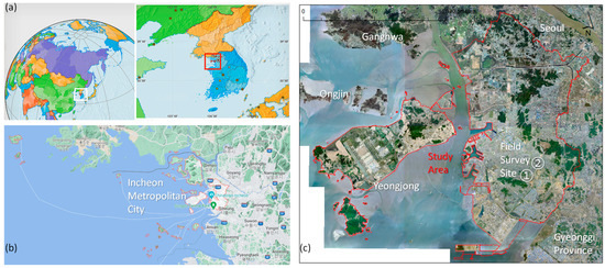 Study area, Incheon, South Korea. (a) The geographical location of the Incheon Metropolitan City “http://www.maphill.com/korea-south/inchon/location-maps/political-map/ (accessed on 8 June 2023)”; (b) Administrative area, including inland, two large islands, and other islands “https://www.google.com/maps/place/Incheon (accessed on 8 June 2023)”; (c) Area where LiDAR 3DPCs were employed; ① and ② are in situ site survey sites.