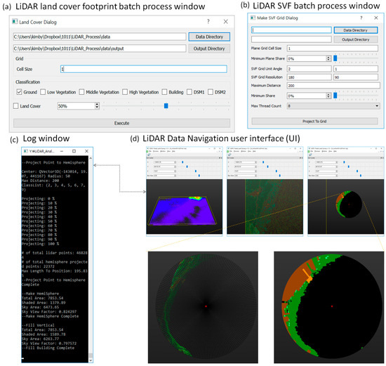 Development of LiDAR 3DPC input and output (I/O) GUI. (a) I/O directory, sampling resolution (cell size), land cover class, threshold (%), etc., for footprint identification. (b) User I/O directory, sampling resolution (cell size), land cover class, threshold (%), etc., for SVF analysis. (c) Console window view of the log according to user control. (d) Single LiDAR dataset can be visualized on GUI to explore virtual 3DPC space. In addition, a virtual sky view projected on the sustaining disk through the hemispher at the observation point is used as an auxiliary data.