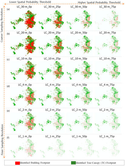 Urban-scale visual comparison of the identified building and tree canopy (TC) footprint generated from the six sampling resolutions (a–f) 1, 2, 4, 10, 20, and 30 m, respectively, and four different SP thresholds (P0, P25, P50, and P75).