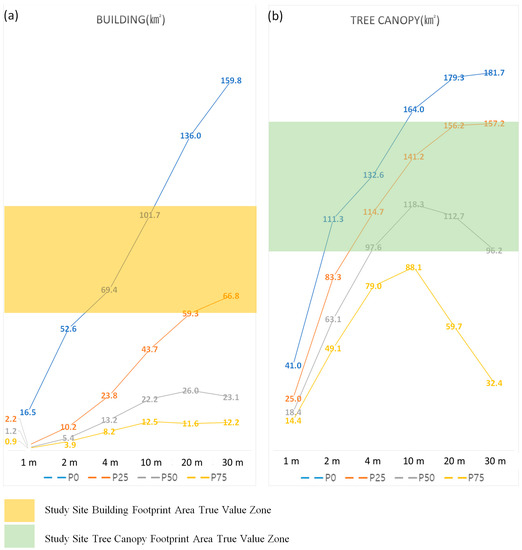 Despite the true value zone wide range set, many identified footprint area values have exceeded the range significantly (Figure 7 and Table 5). As shown in Figure 7a, the chart of the 36 urban-scale building footprint area (km2) values derived from the GUI and applied to the classified LiDAR 3DPCS demonstrates the difficulty in identifying building footprints. Limited parts of the urban-scale building footprint area (km2) P0 and P25 values were in the true value zone, whereas none of the P50 and P75 values reached the true value zone. In the P0 case, the 2 m- and 4 m-based area values were within the true value zone. Both underestimation (1 m) and overestimation with steep linear trends were evident, indicating that the P0 building footprint area values were sensitive to resolution variation. However, in the P25 case, the 10 m-, 20 m-, and 30 m-based values were in the true value zone. Both underestimations (1, 2, and 4 m) were evident. However, the P25 building footprint area values were less sensitive as the resolution became coarser. Hence, we can conclude that when using the given classified building 3DPCs and GUI, P0 is appropriate for finer resolution (2 and 4 m), and P25 is appropriate for 10 m or coarser resolution urban-scale building footprint identification. Meanwhile, GUI options at 1 m resolution or P0 and P75 are not recommended.