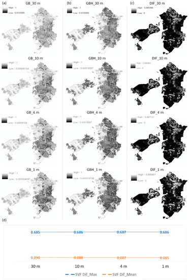Urban-scale visual and statistical comparisons of the SVF generated from the four sampling resolutions (1, 4, 10, and 30 m). (a) TC presence (GB) sky view factor (SVF); (b) TC absence (GBH) SVF; (c) SVF difference (DIF); (d) Statistical comparison of the max and mean values for the SVF DIF.