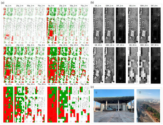 Incheon Central Park magnified visual comparison of the identified building and TC footprints and SVF. (a) Six resolutions (1, 2, 4, 10, 20, and 30 m) and four SP thresholds (P0, P25, P50, and P75). (b) Four resolutions (1, 4, 10, and 30 m) and three analysis types (GB, GBH, and DIF). (c) In situ photographs taken from Incheon Culture & Art Center (1) and Incheon Central Park tree canopy belt (2).