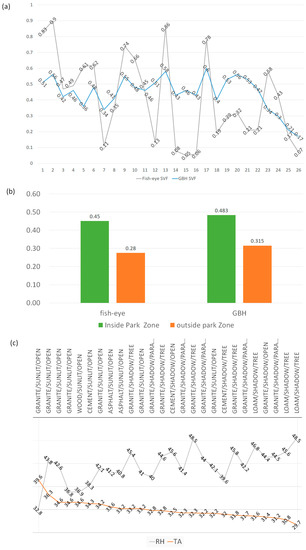 In situ survey site SVF and microclimate. (a) A 26-point SVF value comparison (fish-eye photography vs. LiDAR 3DPC (GBH. 1 m)). (b) Land-use-based mean SVF value comparison (inside park zone vs. outside park zone). (c) Measured air temperature (AT) and relative humidity (RH) variation according to the sunlight environment, ground material, and urban canopy.