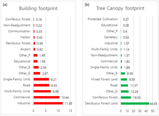 The top 15 ME land covers (L3) and corresponding (a) building footprint area (km2) and (b) TC cover footprint area (km2).