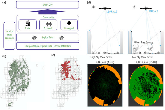 Geospatial data-based digital twin (DT), Smart City vision, and proposed works based on the ALS LiDAR Survey DT plan of NGII in Korea. (a) DT and Smart City (Source: Kedar [41]). (b) ALS LiDAR DB constructed an urban area from 2002 to 2021 (green). (c) NDT supporting ALS LiDAR DB constructed urban area in 2022 (red). (d) City-based urban-scale building and tree canopy identification and SVF analysis using DT LiDAR 3DPC.