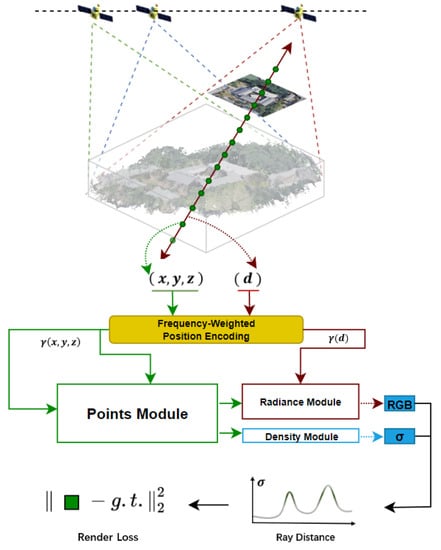 Furthermore, we improve the representation of 3D remote sensing scenes through the implementation of a hierarchical volume sampling strategy and a “coarse to fine” approach, which resemble the techniques employed in the baseline NeRF framework [12]. Leveraging the differentiable properties of the classical volume rendering process, we seamlessly integrate it with MLP networks to facilitate the training of network parameters.