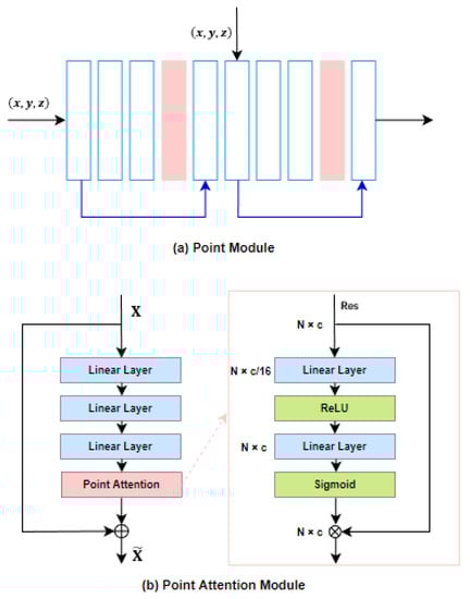 (a) A visualization of the point module architecture. (b) Part of the architecture of the point module (left) and architecture of the point attention module (right). is the number of all spatial points, and is the number of channels.