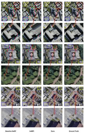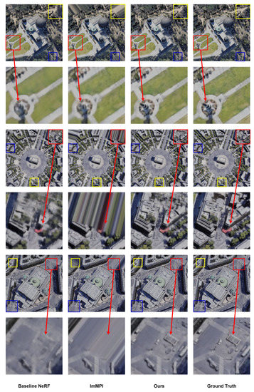 We conducted a comparative analysis of our method with two other state-of-the-art view synthesis methods: baseline NeRF and ImMPI. Baseline NeRF were also included in our ablation study to serve as a benchmark. ImMPI’s work introduced the LEVIR-NVS dataset, which we utilized for comparison in our experiments.