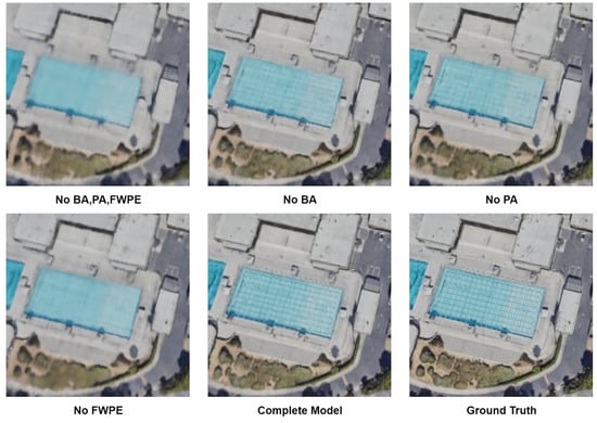 Similarly, we have also presented qualitative visualization results of the ablation experiments as Figure 7, which provide compelling evidence for the effectiveness of the modules proposed in this paper. We select the key image area from the school scene for observation and comparison. The outcomes obtained under the complete model demonstrate remarkable similarity to the ground truth, both in terms of overall effect and intricate details. Conversely, without each of the three modules, the generated results exhibited significant blurriness, leading to the loss of crucial information in the finer details. Moreover, when the frequency-weighted position encoding module is omitted, we observe a significant challenge in generating clear details on the blue platform within the view, which strongly supports the effectiveness of our frequency-weighted position encoding approach. Furthermore, when the point attention and batch attention modules are excluded, we notice the presence of certain discernible details on the blue platform. The surrounding buildings and the positions of some small targets are generated with reasonable accuracy, albeit not as clear as the results achieved under the complete model. This finding confirms that the inclusion of frequency-weighted position encoding leads to clearer details and an overall improvement in the image generation effect, further substantiating the effectiveness of this module. Considering the primary objective of both the point attention and batch attention modules, which is to comprehend the relationships and radiation expressions among points within the neural radiation field, their presence results in the generation of clearer and more detailed information, as well as accurate target positioning.