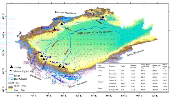 The location of the headwaters in the Tarim River Basin, along with the corresponding meteorological and hydrological stations. The mountainous runoff from its four headwaters (namely, Kaidu River, Aksu River, Yarkant River, and Hotan River) flows into the mainstream, forming the Tarim River. The four headwaters, along with their corresponding tributaries and outlets, are listed. The glacier area and estimated glacier volume were derived from the first China Glacier Inventory and the images were taken around 1965 [15].