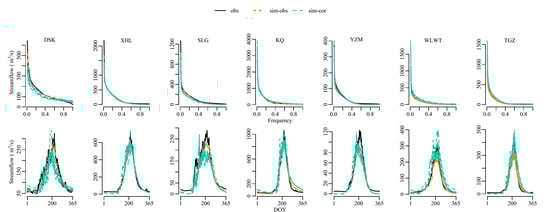 The exceedance plots and hydrographs of daily streamflows of observation, simulations using the SWAT-Glacier model forced by observed meteorological data (“sim-obs”), and bias-corrected RCM outputs (“sim-cor”). Each line represents the averaged hydrograph during the calibration period.