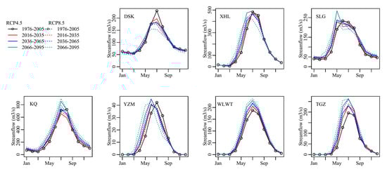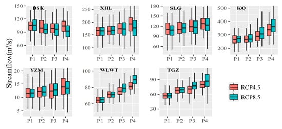 Runoff changes in the headwaters of the Tarim River Basin under RCP4.5 and RCP8.5 scenarios. The whiskers show the 5% and 95% quantiles of the streamflow.