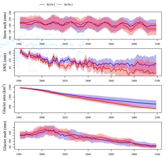 Future changes in snowmelt, snow water equivalent, glacier area, and glacier melt under RCP4.5 and RCP8.5 in the Kumaric River Basin. The shaded area indicates the standard deviation of the ensemble simulations.