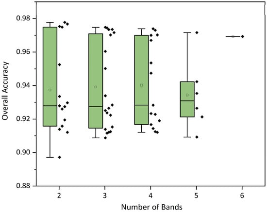 Crop classification’s overall accuracy with different band number combinations. The scatter plot in the figure represents the overall accuracy for different band combinations.
