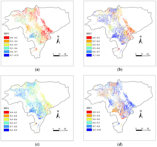 The ET estimation of mixed pixels is a difficult point in the application of this model. The normalized difference vegetation index (NDVI) is considered to be the most effective vegetation index for judging whether the underlying surface is a pure pixel. When the NDVI of a pixel is less than or equal to NDVImin, the area is a pure soil pixel; when the NDVI of a pixel is greater than or equal to NDVImax, the area is a pure vegetation pixel; and when the NDVI is between NDVImin and NDVImax, the area is a mixed pixel. Among them, NDVImin and NDVImax represent the NDVI of bare soil and complete vegetation coverage and generally take the mean value of 3% at both ends of the NDVI frequency histogram [44]: