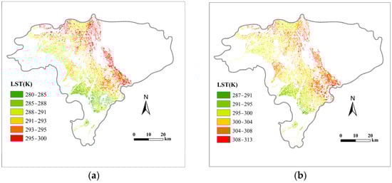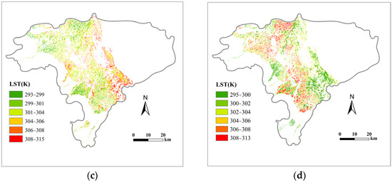 where LST is the land surface temperature (K); λ is the central wavelength of the thermal infrared band (um); A is the product of the Planck constant and the speed of light divided by the Boltzmann constant (the value is 1.439 × 104 um K); Tsensor is the brightness temperature (K), which is obtained by direct calibration of the B10 band of the Landsat-8 image; and ε0 is the surface-specific emissivity.