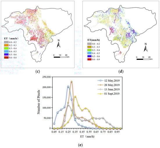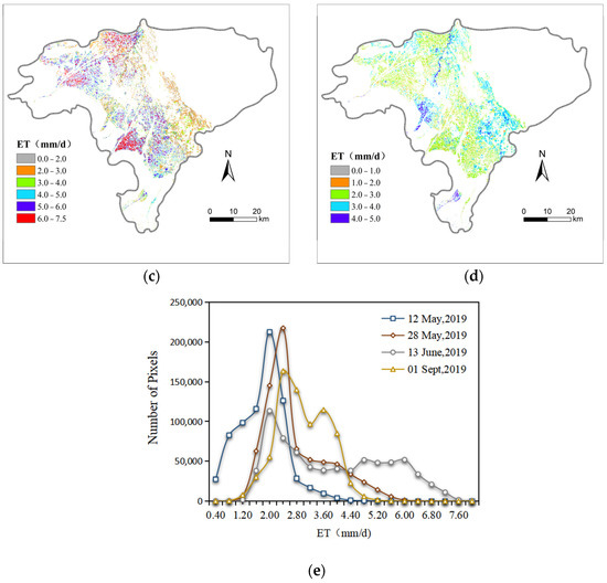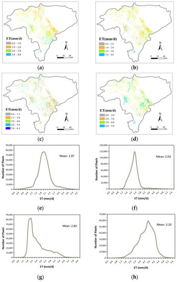 Daily evapotranspiration (ET) extracted by mask in the corn area (mm/d): (a) the result from 12 May 2019; (b) the result from 28 May 2019; (c) the result from 13 June 2019; (d) the result from 1 September 2019; and (e–h) represent the frequency of daily ET on the corresponding dates.