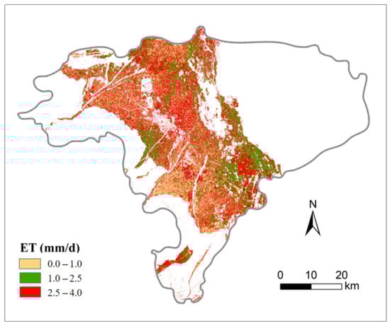 Evapotranspiration (ET) is a crucial component of surface energy balance and water balance, consisting of soil evaporation and vegetation transpiration. It returns 58–65% of terrestrial precipitation to the atmosphere and transports 51–58% of surface energy from land through latent heat transfer [1,2]. Simultaneously, ET is regarded as the most important aspect of agricultural water allocation, with more accurate parameter values leading to more optimized farmland water strategies [3]. Traditional ET, primarily based on observations at stations, is obtained through point-scale field measurements, making it difficult to acquire regional-scale ET. However, remote sensing technology, with its wide coverage, periodicity, and timeliness, can effectively obtain large-scale ET [4]. Remote sensing-based ET estimation methods overcome the limitation of point observation. By using satellite sensors with high spatial and temporal resolution to obtain surface reflectance and combining it with multispectral, hyperspectral, and thermal infrared sensors on unmanned aerial vehicle platforms, the accuracy of the ET estimation model can be effectively improved at the regional level. For instance, the three-temperature model (3T model) proposed by Qiu et al. [5,6] can effectively estimate ET and its components. The model requires fewer input parameters, which can be obtained through remote sensing inversion or meteorological stations. This model has been successfully applied for the quantitative characterization of ET at various scales in the northwest arid zone [7,8,9].