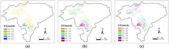 The spatial distribution in May is significantly different. The daily ET value of the wheat area was 0.40–2.00 mm/d on 12 May and 2.00–5.50 mm/d on 28 May. The difference in spatial distribution decreased in June, and the ET of the whole area was relatively concentrated. The daily ET on 13 June was 4.20–7.20 mm/d. According to the time distribution characteristics, the wheat ET increased from May to June and showed a gradual deepening of color from the spatial distribution map. On 12 May, 28 May, and 13 June, the average daily ET in the study area was 1.16 mm/d, 3.44 mm/d, and 5.02 mm/d, respectively.
