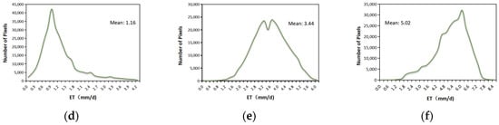 Daily evapotranspiration (ET) extracted by mask in the wheat area (mm/d): (a) the result from 12 May 2019; (b) the result from 28 May 2019; and (c) the result from 13 June 2019. Since the wheat was harvested in September, no date from the month is analyzed here. Finally, (d–f) represent the frequency of daily ET on the corresponding dates.