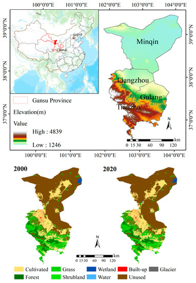 Study area and land use spatial distribution. Wuwei belongs to a warm-temperate continental arid climate with an average annual temperature of 7.8 °C and a precipitation range of 60–610 mm. In terms of administrative divisions, it includes one district, two counties, and one autonomous county, with a total area of 3.32 × 104 km2.