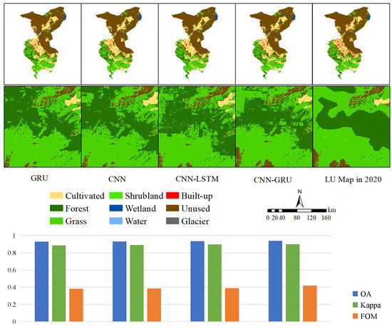 Using Python coding, we calibrated the model parameters with historical data from 2000 to 2010 and generated simulation results for 2020 (Figure 3). To verify the model performance, we compared the results with three sets of indicators, overall accuracy, Kappa coefficient, and figure of merit (FOM). Specifically, we conducted comparisons among (1) The coupled model and single models (CNN-GRU, CNN, and GRU) to examine the importance of spatiotemporal feature extraction, (2) Different recurrent neural networks (CNN-GRU and CNN-LSTM) as feature samplers for comparing the performance of time dimension feature extraction, and (3) Single spatiotemporal models (CNN and GRU) to analyze the impact of temporal and spatial features on time series data simulation.