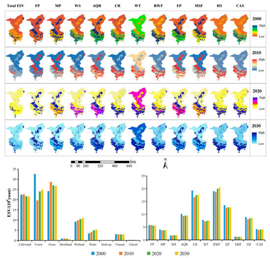 Spatial distribution of total ESV and 11 ESV from 2000 to 2030, and bar graphs are ESVs of different land use types and ecosystem service representations from 2000 to 2030. (FP: food production; MP: material production; WS: water supply; AQR: air quality regulation; CR: climate regulation; WT: waste treatment; RWF: regulation of water flows; EP: erosion prevention; MSF: maintenance of soil fertility; HS: habitat services; CAS: cultural and amenity services).