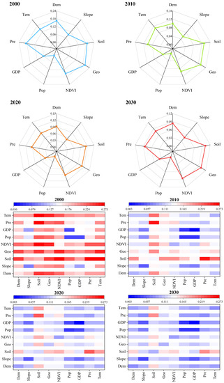 The contribution of single-factor (Radar map) and two-factor (Heat map) to ESV.