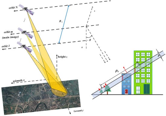 Limited by the side view imaging mechanism, there are numerous geometric distortions in complex ground object scenes, such as shrinkage, occlusion, and layover, which seriously affect the interpretation of synthetic aperture radar (SAR) images. To solve this problem, SAR tomography (TomoSAR) was created. TomoSAR obtains the 3D resolution of targets using multiple SAR images from different perspectives, which has application-significant value in military reconnaissance, topographic mapping, oil exploration, forest cover, urban reconstruction, and other military and civilian fields [1,2,3,4,5].