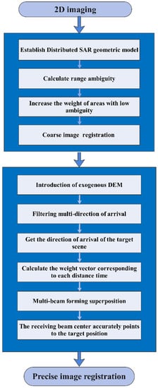 The overall flow chart of 3D imaging is shown in Figure 2. In the 3D imaging process of distributed SAR, 2D imaging of multi-channel SAR echo data is realized first; then, image registration, amplitude correction, and phase correction are carried out to achieve strong coherence between multi-channel SAR images; and finally, height focusing is realized, and the 3D distribution of the scene scattering coefficient is obtained through coordinate conversion. However, there is range ambiguity in the imaging process. Aiming to solve the problem that the range ambiguity affects image registration, a general idea of coarse registration-range ambiguity resolution-precise registration is proposed. Firstly, the weight of special points and regions with a high signal-to-interference ratio is strengthened to realize the overall coarse image registration. Then, the external digital elevation model (DEM) is introduced to obtain the prior knowledge of the target position, which is combined with the DBF algorithm to obtain multi-channel range ambiguity resolution. Finally, precise registration is performed.