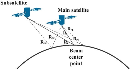 where and represent the bottom view of the main satellite and the sub-satellite, respectively; denotes the beam incidence angle; and represent the antenna range gain of the main satellite and the sub-satellite, respectively; is the backscattering coefficient of ground scattering points; and denotes antenna area.