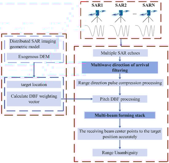 The investigation of range ambiguity resolution can be conducted after the coarse image registration. A multi-channel range ambiguity resolution technology based on multi-beam forming is proposed in this paper, as shown in Figure 7. First, the prior knowledge of the target location is obtained by introducing an external DEM. The accuracy of external DEM can reach 3–10 m, which can provide prior knowledge such as accurate target location for DBF.