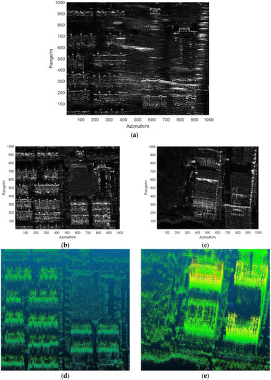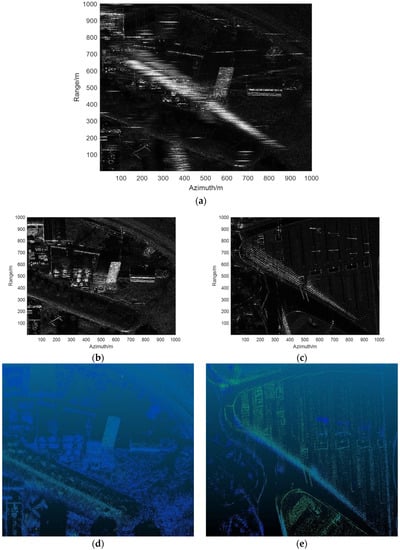 The results of range ambiguity resolution and 3D imaging of area D: (a) the SAR image with range ambiguity; (b) the near scene after range ambiguity resolution; (c) the far scene after range ambiguity resolution; (d) the 3D imaging result of (b); and (e) the 3D imaging result of (c).