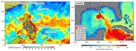 - Lin, I.-I.; Goni, G.J.; Knaff, J.A.; Forbes, C.; Ali, M.M. Ocean heat content for tropical cyclone intensity forecasting and its impact on storm surge. Nat. Hazards 2013, 66, 1481–1500. [Google Scholar] [CrossRef]