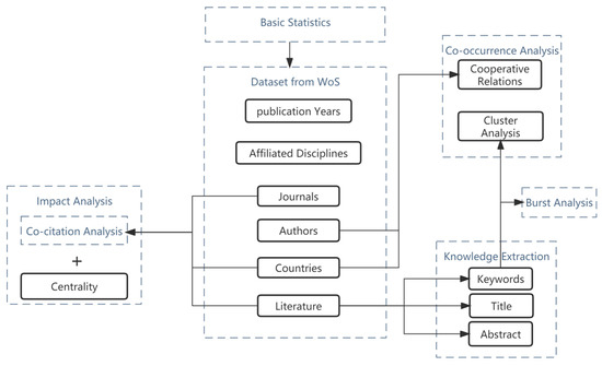 We first downloaded and formed a dataset of publications that met the requirements of this study. The basic information of this dataset, including year, country, institution, journal, and author, was first counted quantitatively. Next, countries and authors were analyzed using co-occurrence analysis to obtain the cooperative relationship. Co-citation analysis was then used to illustrate the influence of journals and authors, and the resulting co-citation network of literature can reveal the evolution of research themes. To obtain the clustering graph and explore the frontiers of the field, we used co-occurrence analysis and burst analysis on keywords. We detected word frequency based on feature words (title, keywords, and abstract) and obtained the interannual variation in the number of study themes and areas. The flow schematic is shown in Figure 1 below.