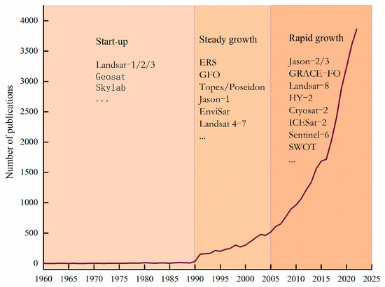 We counted 30,212 papers that fit the research theme from 1960 to 2022. In terms of the time series of published papers, it can be roughly divided into three phases, i.e., the start-up, steady growth, and rapid growth phases, as shown in Figure 2. (1) The period 1960–1990 was the start-up stage, when satellite technology was just being developed and was still in the technology verification period. Launched satellites, such as Geosat, Skylab, etc., generally had low accuracy and unstable performance. Therefore, there were no large-scale scientific applications of these satellite data, and thus the number of publications in this period was less than 100. (2) The period 1990–2005 was the steady growth phase. This phase is represented by the T/P family, the ERS family, and Landsat-5. Due to the improvements in satellite orbiting accuracy and sensor accuracy, the stability and accuracy of satellites were greatly improved during this period. As a result, satellite observation technology was gradually used for inland water monitoring, and the number of related studies increased slowly. (3) The third phase, from 2005 to the present, is the rapid growth phase. This phase has involved the development of multiple satellites and accumulated nearly 40 years of continuous observation data. Satellites such as the Interferometric Synthetic Aperture Radar (InSAR) and Global Navigation Satellite System (GNSS) have also been gradually used for inland water monitoring [6]. Therefore, the number of studies has grown rapidly in this phase.