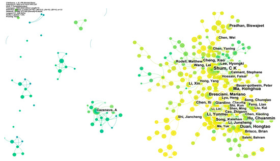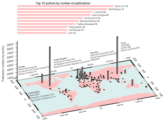 According to the analysis, a total of 183 countries published relevant literature. There are 10 countries that have more than 1000 publications: the United States (9424), China (8960), Germany (2508), Canada (2096), the United Kingdom (2056), India (1977), France (1973), Italy (1386), Australia (1374), and the Netherlands (1082). It is estimated that more than 80,000 authors and 8000 affiliations have made contributions to this field. As shown in Figure 3, the Chinese Academy of Sciences (CAS), National Aeronautics and Space Administration (NASA), Centre National de la Recherche Scientifique (CNRS), and Helmholtz Association contributed 34% of the literature, which represents the main portion of the publications. In addition to these institutions, universities such as the University of California, the University of Colorado, the University of the Chinese Academy of Sciences, and Wuhan University in China have also published more than 600 articles. The top 10 authors by the number of publications are also shown in Figure 3 below, including Shum CK (83), Ma RH (79), Li YM (69), Duan HT (68), Hu CM (63), Bresciani M (60), Pradhan B (58), and Song KS (53).