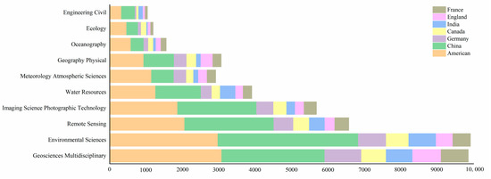 These publications are divided into 162 disciplines according to the Web of Science categories. The information provided suggests that out of the 30,212 papers analyzed, the majority (over 70%) are distributed among several disciplines. The highest percentage (23.45%) falls into the category of Earth multidisciplinary science. Other significant disciplines include environmental science (19.72%), remote sensing (11.27%), imaging science and technology (9.31%), and water resources (9.04%). The remaining 30% of publications cover a range of disciplines such as geophysics, marine science, atmospheric meteorology, ecology, geology, astrophysics, civil engineering, etc. Figure 4 shows statistics on the main subject groups to which publications belong in different countries. It appears that the focus of research varies across different countries. Publications in the United States, Germany, Canada, the United Kingdom, and France focus mainly on multidisciplinary geosciences, while those in China and India are mostly in the field of environmental sciences. This illustrates the differences in research priorities and academic traditions between countries. This difference is also due to the fact that China and India are populous countries and face greater geographical and water resource management pressures. As a result, these countries are paying more attention to inland water monitoring and environmental protection, which may lead to more research focusing on environmental science.