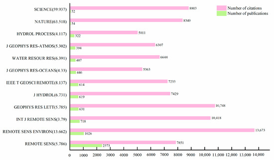 The literature was collected from approximately 1919 different journals. Of these journals, two stand out, each with more than 1000 articles. The two journals are Remote Sensing (2373 papers) and Remote Sensing of Environment (1026 papers). Additionally, several other journals have published more than 600 articles each. These include the International Journal of Remote Sensing (718), Geophysical Research Letters (631), Journal of Hydrology (619), IEEE Transactions on Geoscience and Remote Sensing (614), and Water (547). Figure 5 presents these statistics. Remote Sensing is one of the leading sources of literature on the application of multi-source satellite Earth observation techniques in terrestrial hydrology, with the largest collection of literature. Remote Sensing of Environment focuses on biophysical quantitative methods in respect of terrestrial, oceanic, and atmospheric transport [23,24], with an impact factor of 13.66, making it the most cited journal. The International Journal of Remote Sensing focuses on remote sensing of the atmosphere, biosphere, cryosphere, and Earth, as well as human modifications to the Earth system [25]. The Journal of Hydrology publishes original research papers and comprehensive reviews across all subfields of the hydrological sciences. It includes water-based management and policy issues that affect the economy and society. Science and Nature are known for featuring the latest advancements and development trends in various fields. The articles published in these two journals can provide significant references and spark new ideas for scholars. It is important to note that the information provided is based on the specific journals mentioned in the context of the research analysis. There are numerous other journals in different disciplines that contribute to the overall body of literature.