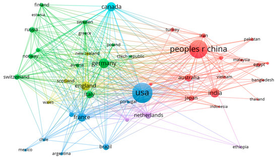 Figure 6 shows the network of cooperation between countries. It is clear from the chart that China and the United States are the two countries with the largest numbers of publications and the highest intensity of cooperation with other countries. China has collaborated with 50 other countries on 3951 articles, of which the United States was the most important collaborator with 1306 links, followed by Germany, Australia, Canada, the Netherlands, and the United Kingdom. The United States, in addition to its close collaboration with China, has established significant partnerships with countries such as the United Kingdom, Germany, France, and Canada. The United States is the most cooperative country, with a total link strength of up to 6646. Indeed, there is a clustering of Denmark, Iceland, Luxembourg, Sweden, and New Zealand into a group, as well as the grouping of Germany, Poland, the Czech Republic, Switzerland, Finland, Hungary, Spain, Italy, and other countries. This phenomenon indicates the influence of regions on the similarity of countries in terms of research collaboration. Geographically close countries in Europe tend to exhibit higher similarities in research collaboration.
