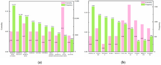 Centrality is an indicator that compares the activity of an institution or author with that of other institutions, authors, etc. and acts as a bridge between them. Nodes with a centrality of more than 0.1 in CiteSpace are called critical nodes. Figure 8a shows the top 10 most cited journals and their centrality. Remote Sensing of Environment, Geophysical Research Letters, and the International Journal of Remote Sensing are the three journals with the most citations. Different journals have different focuses, and the literature they include is also different. Science of the Total Environment is an international multidisciplinary journal with the widest range of disciplines. Its centrality exceeds 0.1, which is the highest centrality of all the journals.