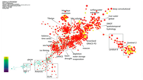The co-citation network of the literature takes on a static form with a time series. As shown in Figure 9, in this co-citation network, the article written by Gorelick N. et al. on promoting the Google Earth Engine (GEE) in 2017 is the most cited paper [38]. This means that more users can access and take advantage of the data, tools, and functions provided by the platform. This will make data analysis and processing faster and interdisciplinary and cross-border cooperation stronger. GEE also highlights the use of time-series satellite data for large-scale monitoring of land and water dynamics [2,39]. Pekel JF et al. collected millions of Landsat images on GEE and quantified the global changes in surface water between 1984 and 2015, leading to the production of a comprehensive global map of surface water [40]. In an article cited 386 times in the field, the study identified prolonged drought and human activities as significant contributors to global surface water transformation. Moreover, three of the other top five co-cited papers are about GRACE, including the JPL RL05 mascon and CRS RL05 mascon solutions [41,42]. The gravity field model solved using GRACE data has become an important means for large-scale land mass migration changes, such as global sea level transformation, regional surface water monitoring, polar ice sheet and mountain glacier melting, and seismic coseismic change [5,43,44]. At present, the latest GRACE data have been updated to version RL06. The literature in respect of Ice, Cloud, and land Elevation Satellite-2 (ICEsat-2) and Surface Water Ocean Topography (SWOT) has also been co-cited more than 100 times [45,46]. These technologies, along with other relevant datasets such as ECMWF Reanalysis (ERA5), Bedmap, Modern-Era Retrospective Analysis for Research and Applications (MERRA), Global Land Evaporation Amsterdam Model (GLEAM), and Randolf Glacier Inventory (RGI), contribute to the key knowledge of multi-source satellite Earth observation technology in inland water exploration.