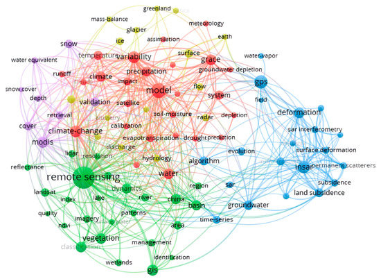 Co-occurrence analysis is a commonly used method in text mining and topic modeling. The principle of co-occurrence analysis is to extract keywords and analyze the connections between them based on their co-occurrence frequency. Figure 11 shows the breakdown of the clusters. Cluster 1 is related to remote sensing image and surface water monitoring and consists of the keywords remote sensing, Landsat, lake, river, dynamic, wetland, basin, classification, geographic information system (GIS), etc. Cluster 2 mainly includes keywords such as model, groundwater, climate change, drought, grace, depletion, prediction, etc., which are related to gravity satellite and groundwater monitoring. Cluster 3 relates to MODIS and monitoring the thickness of snow cover. Cluster 4 is associated with the use of satellite altimetry, including radar and laser measurements, for monitoring ice sheets. It involves ice characteristics, mass balance, and hydrological processes, particularly in regions like Greenland. Cluster 5 is significantly far away from the other four clusters; it appears to be relatively independent and less directly related to the other four clusters. This cluster focuses on the application of InSAR and GNSS for observing land subsidence and its dynamic response to changes in inland water storage.