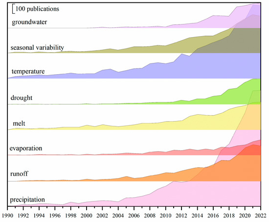 To gain insights into the evolution of research topics and identify frontier themes, we also analyzed the frequency of hydrological phenomena and study areas since the 1990s. The search scope encompasses titles, keywords, and abstracts. The analysis tracks the temporal evolution of these topics.
