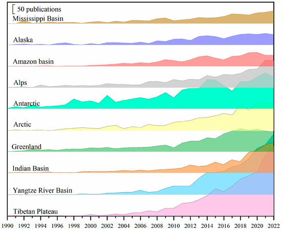Figure 13 depicts the 10 study areas with the highest number of occurrences. They are Antarctica (2153), Tibet (2055), the Yangtze River Basin (1799), the Arctic (1342), Greenland (1273), the Alps (1115), the Indian Basin (956), the Amazon Basin (740), the Mississippi Basin (703), and Alaska (682). Compared with other study areas, the study of continental glaciers such as Antarctica and Greenland started early, especially the exploration of Antarctica, accumulating more than 160 publications before the 21st century. According to statistics, the study of polar glaciers has the most overlapping trends, and both locations have seen a decline in numbers in recent years. In the 21st century, there has been a notable increase in quantitative studies focused on regions such as the Indian Basin, Yangtze River Basin, and Qinghai–Tibet Plateau. These areas are heavily influenced by humans and have a wide-ranging impact, making them popular study areas in recent years. These areas are expected to remain hot research topics in the future. Due to the special geographical location and harsh natural environment, the number of hydrological and meteorological stations on the Qinghai–Tibet Plateau is limited. For a long time, research on the climate response mechanism of lake changes on the plateau was mostly restricted to the qualitative description of precipitation, evaporation, temperature, wind speed, cryosphere melting, and other climatic factors. In the past decades, advancements in technology, recognition of the importance of related research, data-sharing initiatives, and interdisciplinary cooperation have resulted in significant progress in the quantitative study of the Qinghai–Tibet Plateau, making it the most popular study area with the fastest growth rate and most increments [58]. In the comparison of the time dimension, the results of this statistic show that the main research area in this field has changed from polar glaciers to the Qinghai–Tibet Plateau and large river basins, such as the Yangtze River Basin and the Indian Basin.