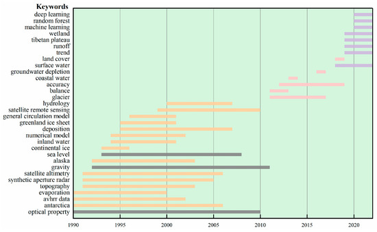 As shown in Figure 14, the results reveal three distinct phases in the evolution of research topics in this field. During the first phase (1990–2000), a significant number of studies utilized technologies such as satellite altimetry for Earth observation. The acquired information was predominantly used for the development of numerical models and general circulation models. The popular study areas during this phase were primarily focused on large glaciers, including Antarctica and Alaska. This phenomenon echoes the conclusions above. In the second phase (2000–2018), researchers increasingly emphasized the application of related technologies to study surface water, glacier mass balance, hydrology, land cover, and other related aspects. This period involved a surge in publications showcasing the practical applications of remote sensing data. In the third phase (2018–present), improvements in the resolution and accuracy of various sensors and a more complete Earth observation series have accumulated massive amounts of data for scientific research. New technologies, such as automatic identification and intelligent batch processing, have emerged. The latest methods for data processing, including random forests, machine learning, and deep learning, have gained prominence. Researchers have turned their attention to a combination of hydrological phenomena and interdisciplinary data-processing algorithms. Intelligent image recognition and data processing based on the above algorithms have become the forefront of development in this field. Throughout the entire timeline, scholars have demonstrated a longstanding interest in studying the optical properties of various sensors, gravity detection, and sea levels. As shown in Figure 14, the timeline of these three keywords is grayed out. This phenomenon indicates their sustained importance in the field of hydrological research.